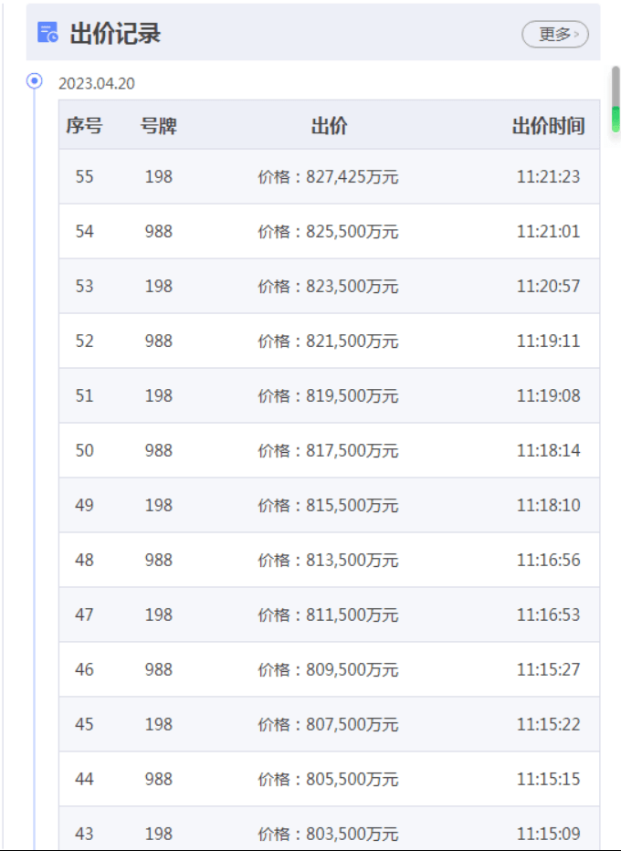 自4月18日上午11点起,该地块就有房企开始竞价,到今日上午8点55分起,前后4家房企一共产生55次竞价,直至达到最高限制地价82.7425亿元,折合成交楼面地价为32176元/平方米。