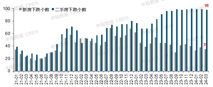 从房价涨跌城市数量看,根据中国房地产指数系统百城价格指数,3月,百城新建住宅价格环比下跌城市数量为35个,百城二手住宅价格环比下跌城市数量为98个,二手房价格下跌城市已连续10个月超90城。