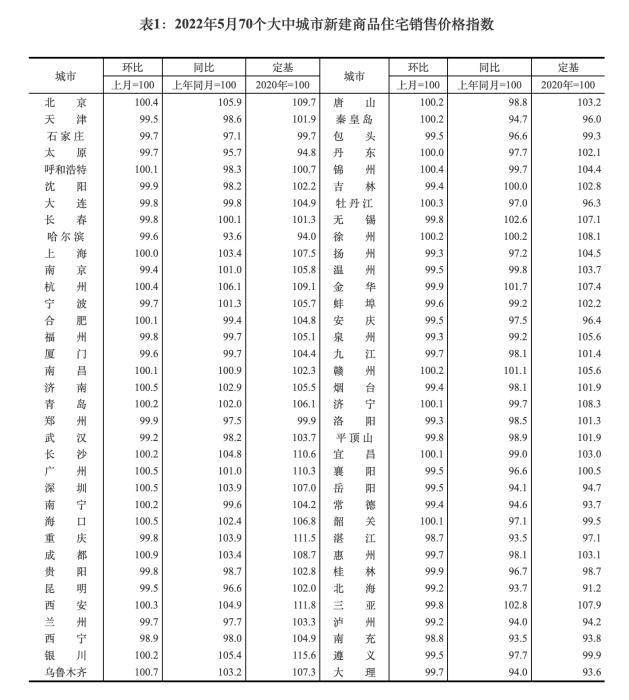 “整体看,5月新建住宅与二手房住宅市场涨跌不同步,新建住宅环比下降城市减少,二手房价格环比持平或下降。”张大伟总结道。2022年5月70个大中城市新建商品住宅销售价格指数。截图自国家统计局官网