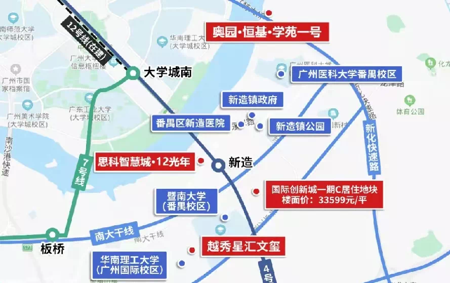 首先,离地铁太远,项目离最近的新造地铁站4.8公里,这对靠地铁通勤的打工人来说极其不便。而且项目临近高架桥,车流高峰期影响较大,尤其是13#。此外,项目周边较为杂乱和荒凉,多为驾校、农场、工厂等。虽项目自带8000方商业配套,但周边没有大型商业配套,需依附万博中心(16km)、琶洲(10km)。
