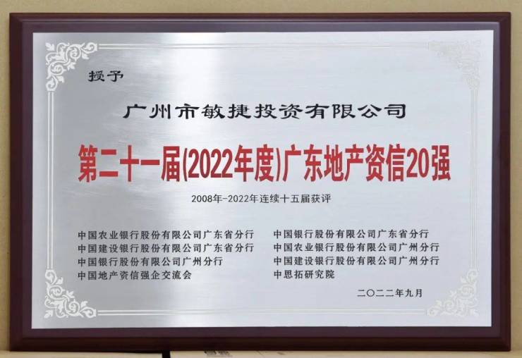 第二十一届(2022年度)广东地产资信20强” 和第十二届(2021-2022年度)深圳地产资信10强”线上发布会发布了新一届“广东地产资信20强”榜单。凭借稳健的财务管理、卓越的资信记录、优秀的企业信誉,敏捷集团获得“第二十一届(2022年度)广东地产资信20强”荣誉称号,这亦是敏捷集团连续15年荣膺此奖。