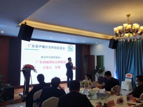 在承办单位领导致辞中,广东鸿威国际会展集团有限公司总裁王登云表示很荣幸能够加入成为广东省声像灯光科技促进会的理事单位之一并承办本次理事会议,鸿威国际会展集团将充分利用线下展会平台资源及线上“云展动力”数字孪生获客系统的优势帮助广东乃至全国声像灯光企业突破疫情困境,开拓国内外文娱演艺市场。