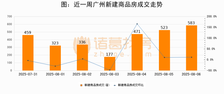 根据广州市住房和城乡建设局数据显示,2025年08月06日广州新建商品房成交583套,较昨日增加60套,环比上涨11.5%
