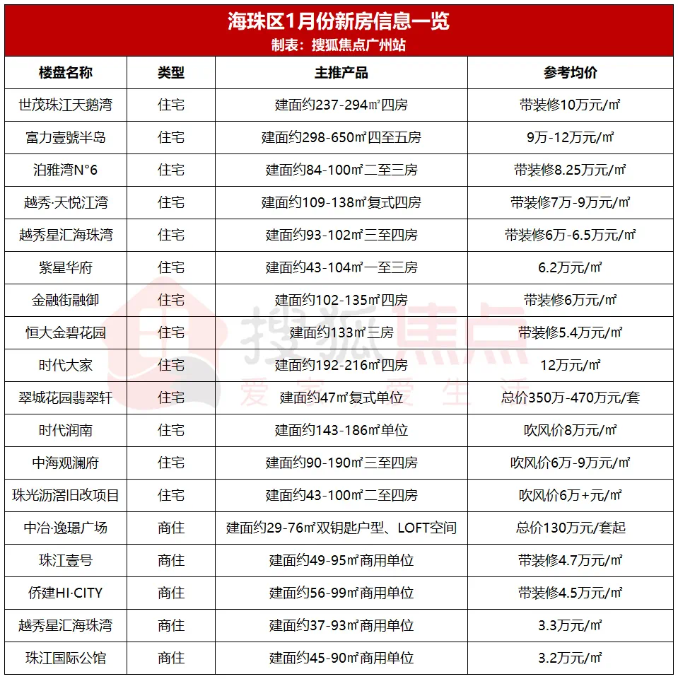 当前,海珠区在售新房并不多,售价跨度较大,主要在5.2-12.8万元/㎡上下。