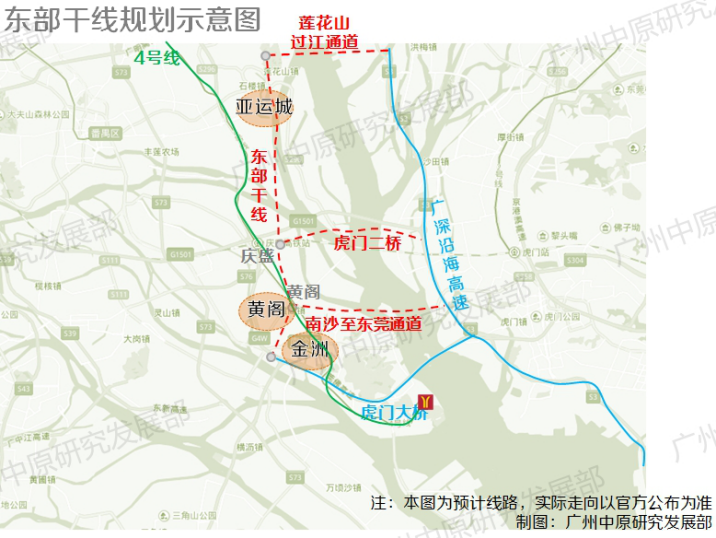 1号公路南沙段,将拟建东部干线。根据示意图显示,东部干线北接南大干线(莲花山),呈南北走向,与虎门二桥、南沙至东莞过江通道及虎门大桥连接。从大湾区交通的角度而言,东部干线对于连接珠江东西岸起重要作用,公路沿线区域如南沙庆盛、黄阁、石楼,东莞虎门等将成为重要的物流枢纽以及大湾区商贸片区。