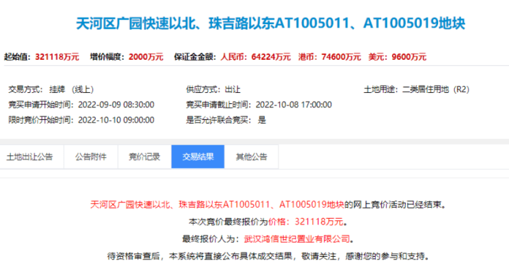 该地块是去年广州第三轮集中土拍中,由武汉鸿信世纪置业有限公司竞得的,总价321118万元、折合楼面价38992元/平。