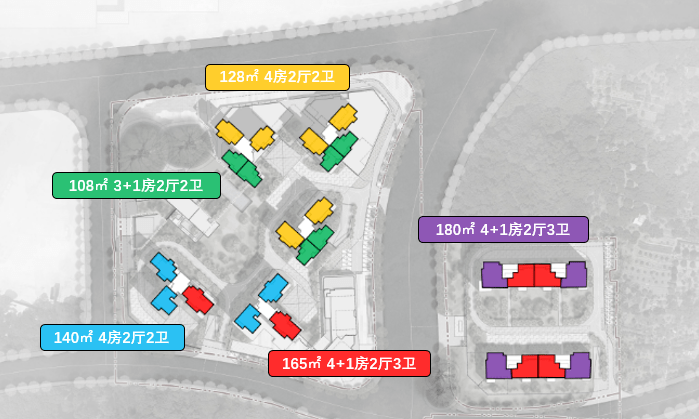 地块一涵盖建面108-165平的四房。地块二涵盖建面165-180平的4+1房,以及少量超过200㎡顶复,均为广州人最喜欢的南向布局。