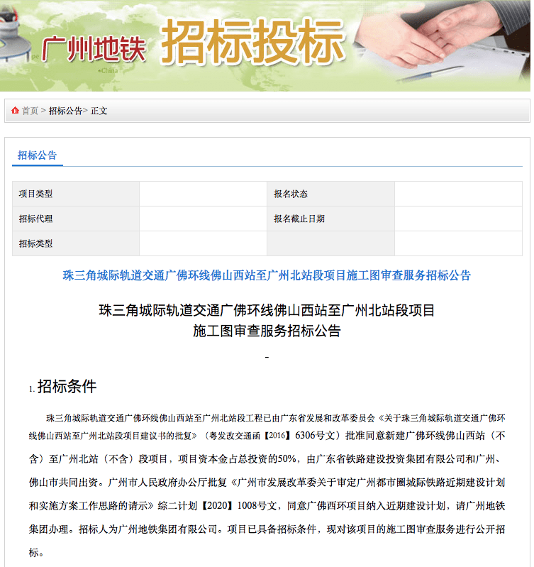 日前,广州地铁集团发布了《珠三角城际轨道交通广佛环线佛山西站至广州北站段项目施工图审查服务招标公告》,公告显示,广州市人民政府办公厅已批复《广州市发展改革委关于审定广州都市圈城际铁路近期建设计划和实施方案工作思路的请示》,同意广佛西环项目纳入近期建设计划,项目已具备招标条件,建设总工期为5年,有望今年年底开建。