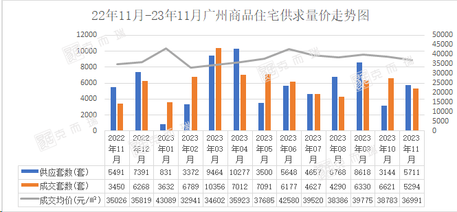 克而瑞数据监测显示,11月广州成交5294套商品住宅,环比下降20.04%;成交均价36991元/㎡,环比下降5%。