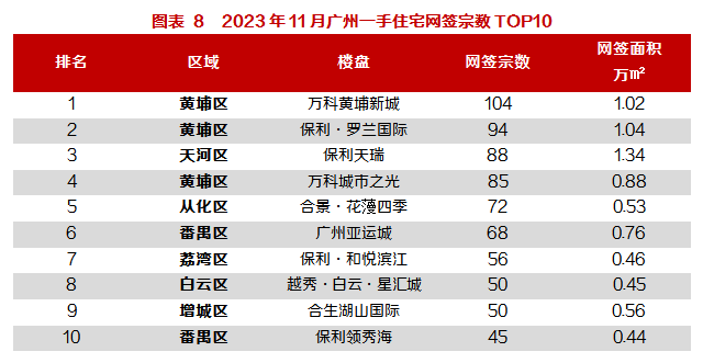 聚焦到热门成交楼盘部分。据广州中原研究发展部数据,11月网签TOP10榜中,除了保利天瑞和万科城市之光外,其他上榜楼盘多为本区域内以“性价比”出圈的刚需盘为主,如万科黄埔新城、亚运城、合生湖山国际、保利领秀海等。