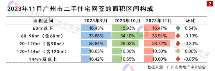 从成交面积段来看,60㎡以下所占比例环比增长0.54%,60-90㎡、90-120㎡和144㎡及以上所占比例环比分别下降0.19%、0.30%和0.05%,120-144㎡所占比例环比持平。