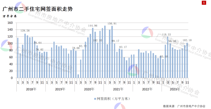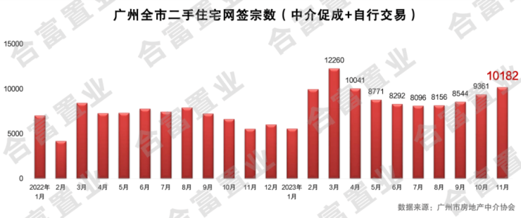 据广州市房地产中介协会数据,11月(10.26-11.25),广州市二手住宅整体(中介促成+自行交易)网签宗数为10182宗,环比增长8.77%,同比增长83.69%。