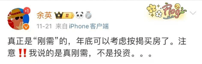 上月末,全国房地产经理人联盟副主席,“预言帝”余英在微博上发话:真正是“刚需”的,年底可以考虑按揭买房了。