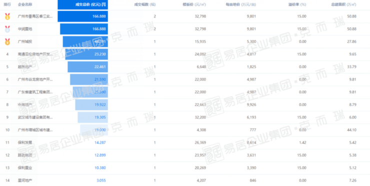 荔湾区和天河区则分别位列成交金额第二、第三名,揽金规模为75.1亿元、66.25亿元。