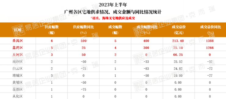 克而瑞数据显示,今年上半年,除越秀、海珠两区无宅地供应,另外9区皆有新宅地上线。