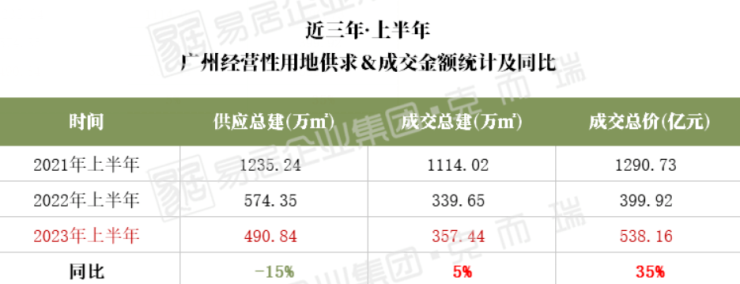 克而瑞统计到,2023年上半年,广州总计供应经营性用地44宗,供应总建490.84万方;成交32宗,成交总建357.44万方;最终,上半年经营性用地的成交金额为538.16亿元。