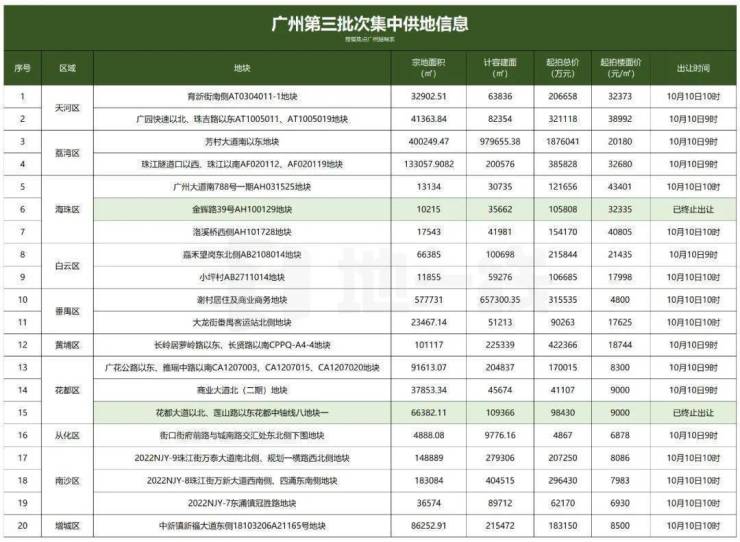 拟出让的20宗涉宅地中,海珠金辉路39号地块及花都中轴八地块一提前宣告终止出让。其余18宗地于10月10日9时、10时分批出让。