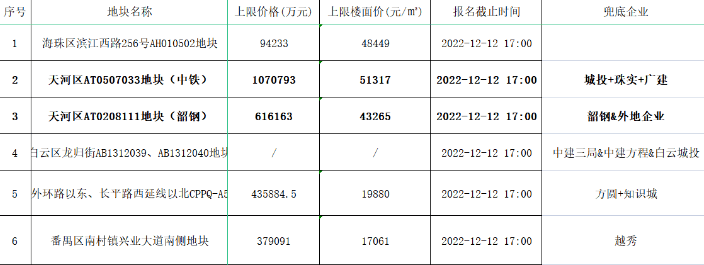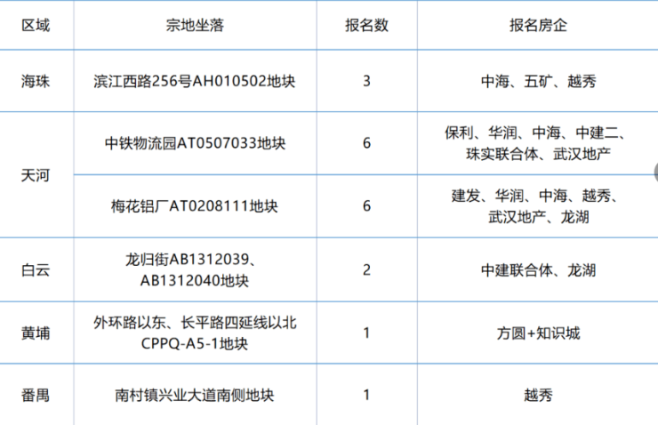本周四(12月15日),广州迎来2022年第四轮集中供地。作为土地市场的年末收官之战,目前各宗地块房企报名情况如何呢?