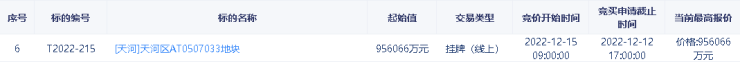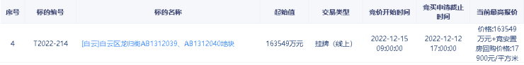 另外,截至发稿前,小编从广州公共资源交易中心获悉,天河中铁物流园地块及白云龙归安置房地块已率先获得房企报价。