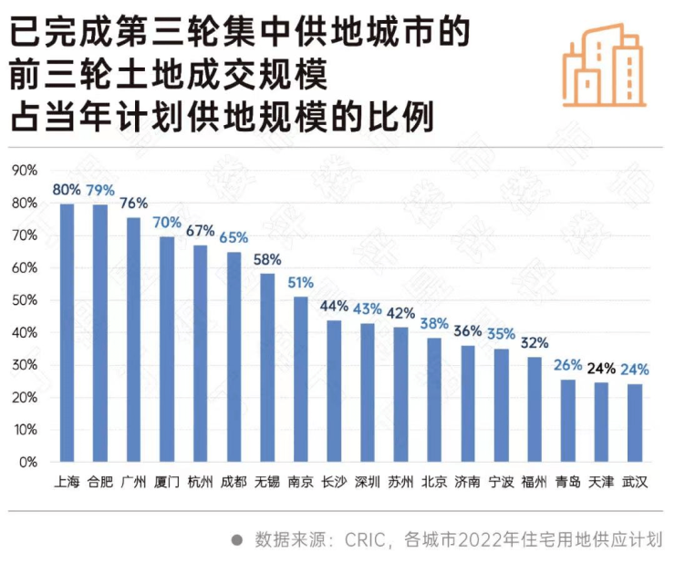 据克而瑞监测,在已完成第三轮集中供地的城市中,广州的成交规模占全年计划供地规模的比例为76%,仅次于上海、合肥。
