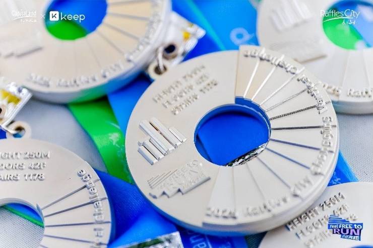 本届赛事的完赛奖牌凝聚了运动精神和城市印记,正面以浮雕工艺勾勒重庆来福士标志性楼体,饰以螺旋上升的阶梯纹路,以其递进的切面呼应着重庆的特色地貌,深刻诠释向上攀登、步履不息的赛事精神。奖牌背面特别设有刻名区域,让每位获奖者都能收获一份独一无二的专属荣耀。主办方还精心准备了赛事包、赛事服、毛巾等赛事装备,号码布也能塑封留念。