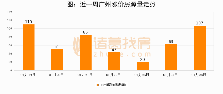 根据诸葛找房数据显示,广州24小时涨价房源量为107套,较01月24日增加44套,环比上涨69.8%。与此同时,涨价房源占比小幅扩大,业主信心有所提升。
