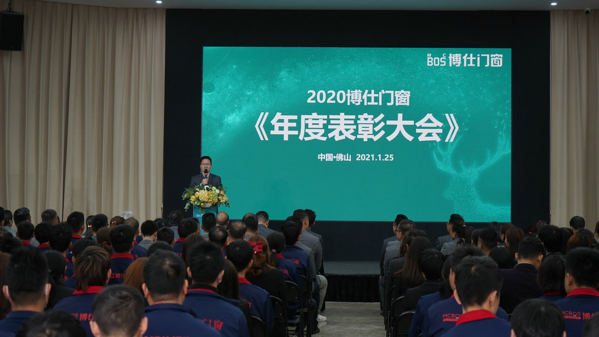 2021年1月25日,2020博仕门窗年度表彰大会在总部培训中心隆重举行,大会由公司总政委王券期主持。