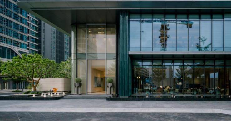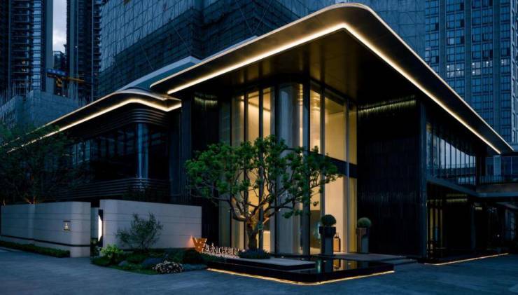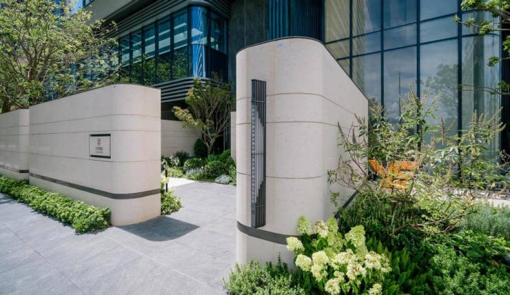 会所立面以景德镇凹面瓷板与金属夹丝玻璃打造,定制青绿釉色瓷柱经拉胚、烧制等多道工艺制成,由30年以上经验的老师傅制作得以完美展现。玻璃边缘以金属镶嵌收边,金属丝嵌入玻璃拼接误差小于毫米,远超豪宅常规精度,整体如立体奢侈品般,将稀缺性与匠心完美融合。