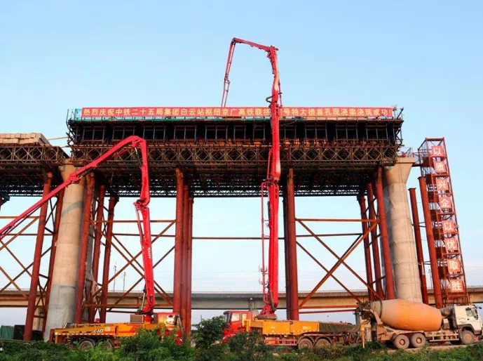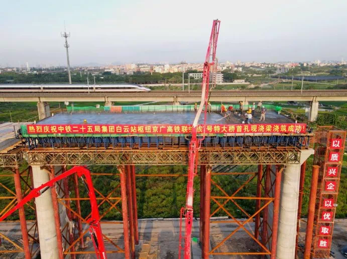近日,由中铁二十五局承建的白云站枢纽重点控制性工程——京广高铁联络线1号特大桥首孔现浇梁顺利完成浇筑。这标志着白云站引入京广高铁的关键工程取得突破性进展,为后续架梁施工的开展创造了有利条件。