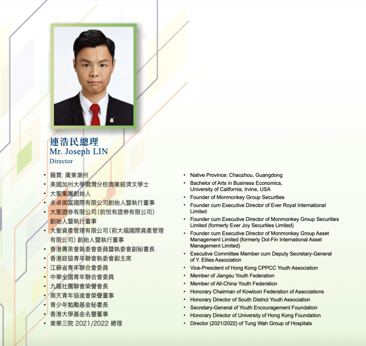 连浩民,29岁,曾投资及管理多家公司,为大圣集团控股有限公司的创始人。大圣集团的愿景是成为一家提供一站式金融服务的金融科技企业,子公司拥有香港证监会颁发可进行排名前列类、第四类及第九类受规管活动的牌照。同时,连浩民还为永卓御富国际有限公司的董事长、该公司的主要业务为从事海外房地产投资。除了上述职务之外,连浩民还担任香港第六届选举委员会委员、中华全国青年联合会第十三届委员、九龙社团联合第九届首席会长、香港个人资料隐私专员公署第64届个人资料(隐私)咨询委员会委员、东华三院2021/2022辛丑年总理、香港政协青年联合会执委会第四届副主席、香港菁英会执委会委员暨第十四届执委会副秘书长、江苏省青年联合会第十二届港澳界别委员、香港青年联会第二十九届常务董事、南天青年协进会第八届荣誉董事、青少年勉励基金副主席暨秘书长以及香港大学基金名誉董事。