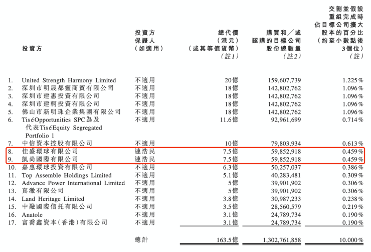 值得注意的是,佳盛环球有限公司和凯尚国际有限公司的投资方均为连浩民,两家公司均出资7.5亿港元,各认购股份59852918股,持股比例分别为0.459%。根据当时的公告介绍,佳盛环球为一家根据萨摩亚法律注册成立的公司,主要从事投资控股,最终实际控制人为连浩民。