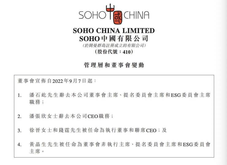 9月7日,SOHO中国发布重磅人事变动消息:潘石屹辞去公司董事会主席、提名委员会主席和ESG委员会主席职务;潘张欣辞去公司CEO职务,此后两人仅保留执行董事的职位。