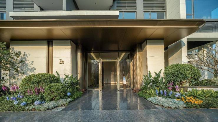在示范区入口处,入口门楼以自然隐奢的姿态拥抱城市,定制涌泉灯、蓝宝石奢石等精致选材,营造出尊贵、惬意的松弛感,奢石“蓝宝石”装置呈现流光溢彩的观感,历经2000公里跨国选材与3轮人工色差筛选,单平米成本远超同类园林。此外园林中还暗藏多项 “隐形奢侈”,为200 +棵名贵树种打造独立微气候,实现自然场景的共生,从工艺细节到艺术级臻品,实现了一次人文与工艺的交融奢享。