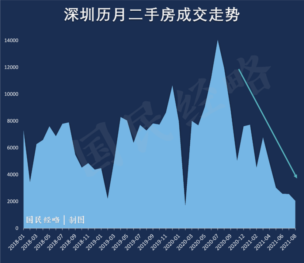 2021年8月,深圳二手住宅成交套数为2043套,环比下跌20.10%,同比下跌81.96%,逼近“1”时代。