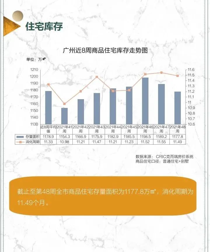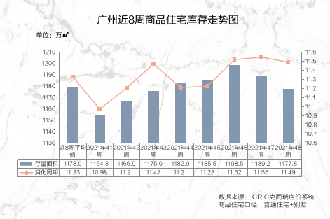 截止至第48周全市商品住宅存量面积为1177.8万㎡,消化周期为11.49个月。