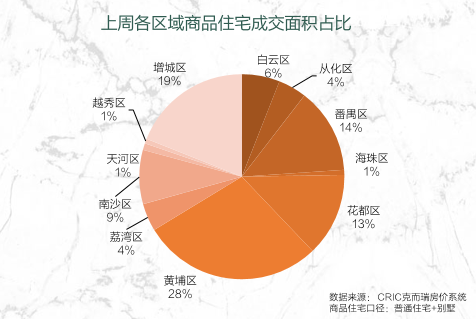 其中花都区恒大悦府前期销售单位本周集中签约,助力花都区涨幅排名前列;黄埔区网红盘万科城市之光集中转签,区域成交量激增,同时带动中心六区成交量环比增加39%,成交面积为11.91万㎡。