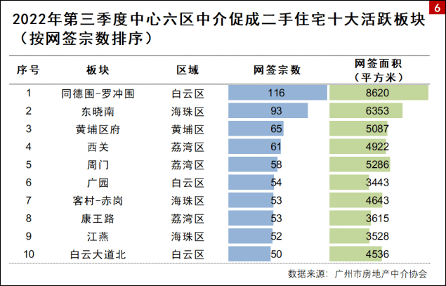 中心六区中介促成的十大活跃板块方面,同德围-罗冲围板块雄踞榜首,网签宗数环比增长17.17%;东晓南板块和黄埔区府板块分居第二位和第三位,网签宗数环比分别回落9.71%和19.75%。