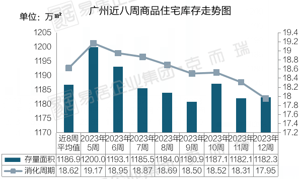 截止至第12周,全市商品住宅存量面积上升至1182.3万㎡,去化周期缩短至17.95个月。
