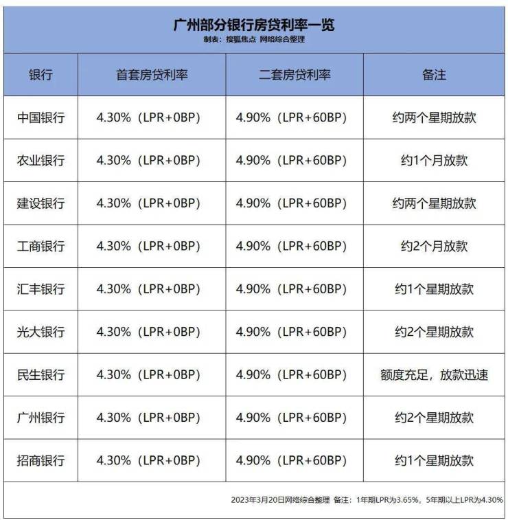 目前广州,包括四大银行在内的银行采用的最低首套房贷利率为4.3%(即LPR+0个基点)。关于二套房的利率,广州20家主要银行使用的利率是4.9%,即LPR+60个基点,期限5年以上。