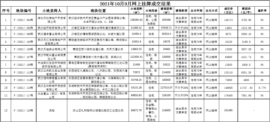 据悉,P(2021)116号东湖高新地块经过20轮竞价,被武汉左岭新城开发投资有限公司149800万元摘得,楼面价11747 .63元/平,溢价率6.77%,为今日首宗溢价地块,其余14宗地块均为零溢价成交。