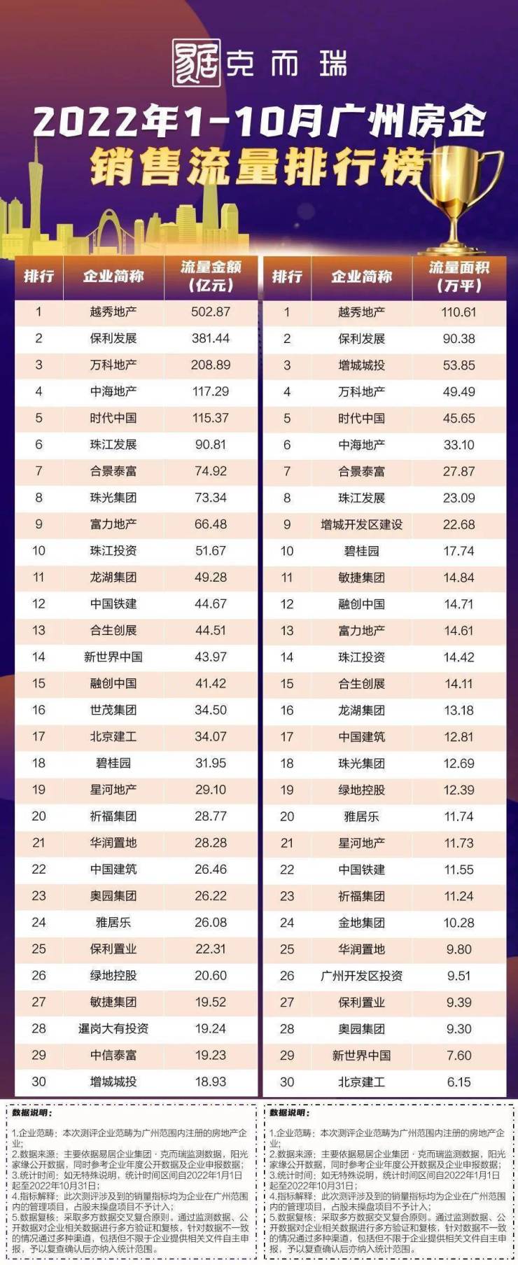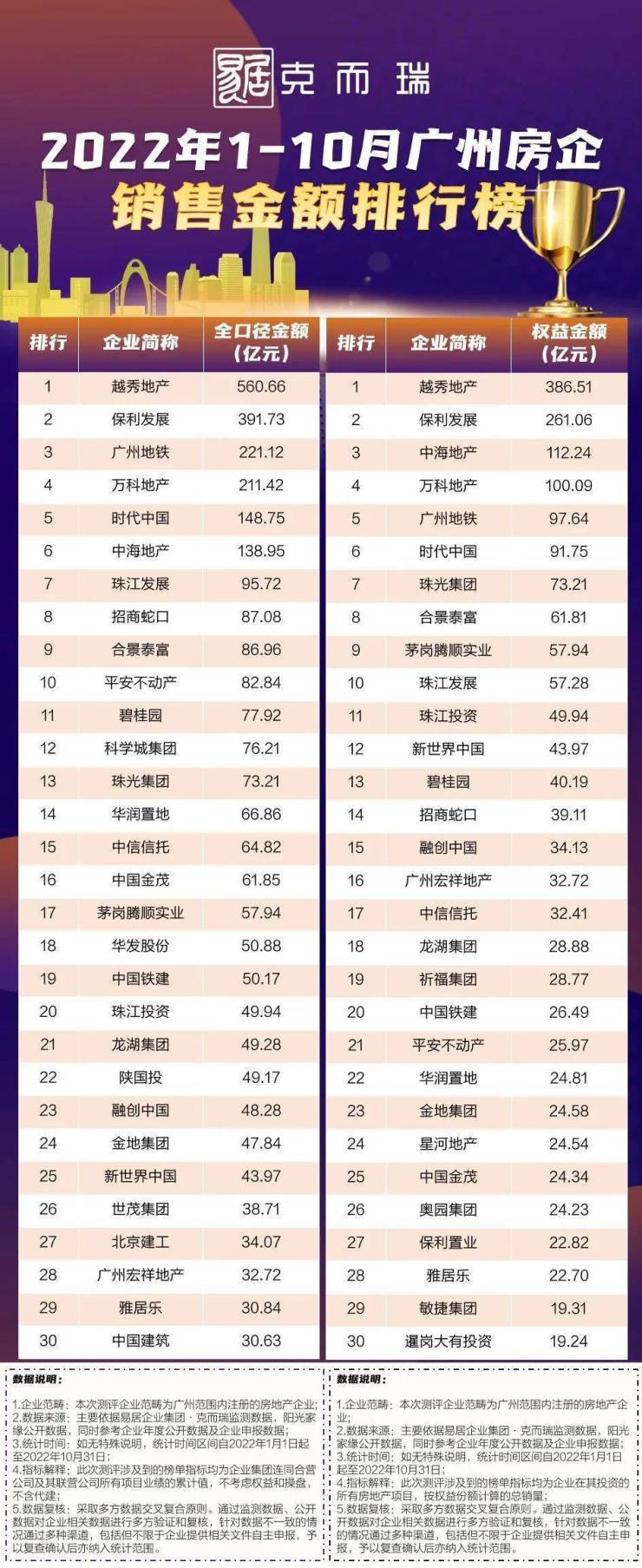 2022年1-10月广州房企销售排行榜,四榜连发---全口径金额、权益金额、流量金额、流量面积,多维度全方位解读房企业绩和销售布局。