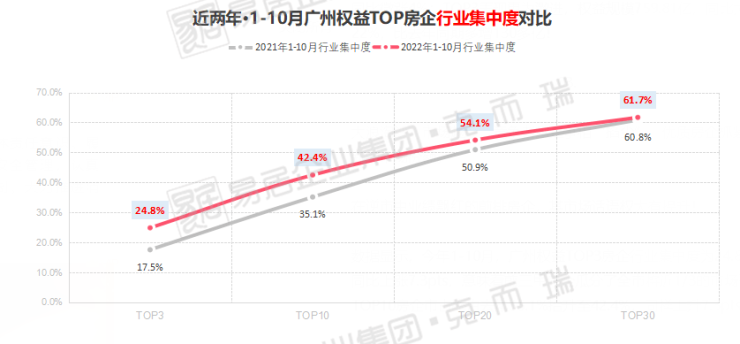 数据显示,今年1-10月,广州权益TOP3房企行业集中度为24.8%,同比上涨7.3pts,意味着前三房企瓜分了全市将近1/4的市场蛋糕;TOP10房企市占率由去年35.1%抬升至42.4%,同样上升7.3pts。