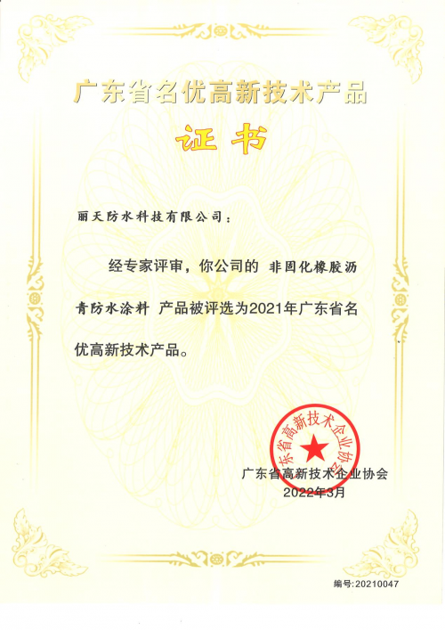 近日,丽天防水喜获佳音,丽天防水研发生产的“非固化橡胶沥青防水涂料”经广东省科学技术厅审核通过,被授予2021年“广东省名优高新技术产品”。