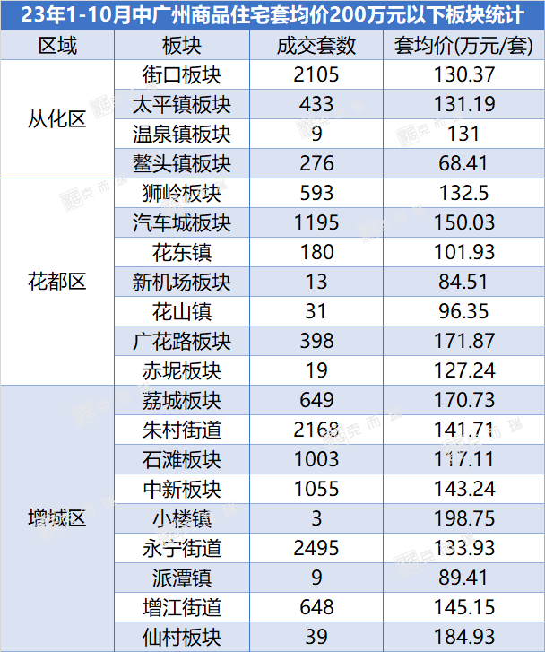 另外,该总价段共有3个板块今年1-10月中成交套数超过2000套,分别是增城永宁街道、朱村街道以及从化街口板块。