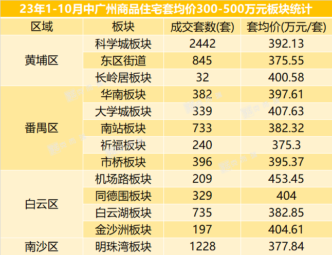 可以看到,今年1-10月中该总价段置业热门板块为科学城板块,合计成交2442套商品住宅,明珠湾板块1228套位居第二位,第三位是白云湖板块共成交735套。