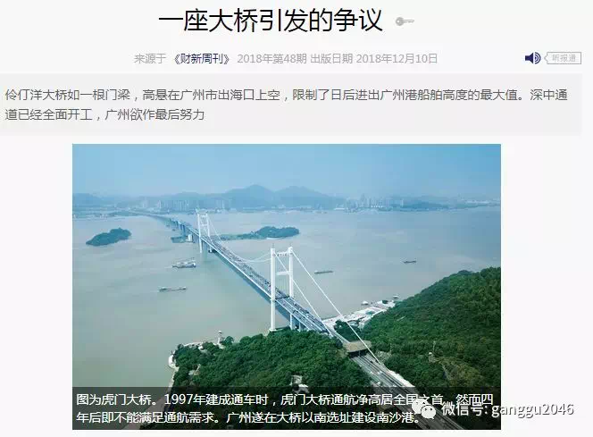 关于虎门大桥教训。据该文报道称:广州对此记忆惨痛。虎门大桥通航净高60米,1997年建成通车时为全国之最。彼时,多方认为,这一通航净高至少能管50年。约四年后,虎门大桥就不能再满足通航需求,载重10万吨以上的集装箱船无法通过。这大大限制了虎门大桥上游的港口资源开发。也就是在这一年,广州在虎门大桥以南选址,开建南沙港。