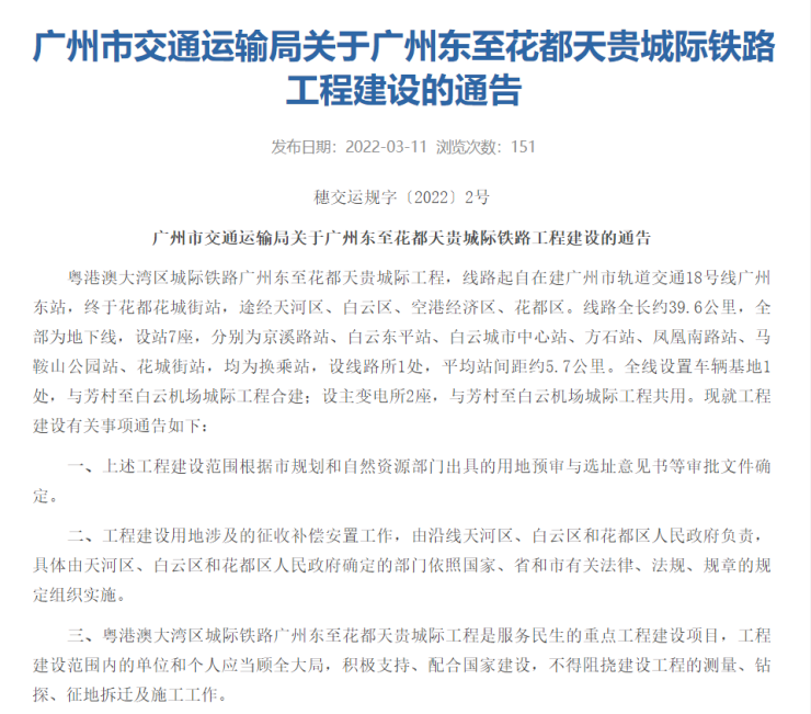 近日,广州市交通运输局发布建设通告,要求广州东至花都天贵城际工程(18号线北延伸段)、芳村至白云机场城际工程(22号线北延伸段)加快推进建设速度。18号线作为国内排名前列条时速160千米的全地下市域快线,纵贯了番禺广场、琶洲、珠江新城等几大CBD,建成后将成为广州贯穿南北商务中心的黄金通道;22号线则接驳白云机场、白云(棠溪)站、广州南站、南沙客运港等交通站点,建成后将串联海陆空交通枢纽,成为是广州重要的交通大动脉。