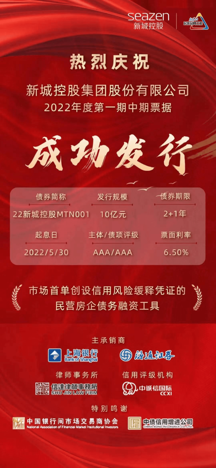 2022年5月24日,我国排名前列专业债券信用增进机构中债信用增进公司和上海银行联合创设信用风险缓释凭证,助力新城控股发行2022年排名前列期中期票据。信用风险缓释凭证拟创设总金额不超过1.3亿元,支持新城控股融资总规模不超过10亿元。本期信用风险缓释凭证搭配债券的品种为中期票据,期限2+1年,有效支持了企业中长期限融资需求。