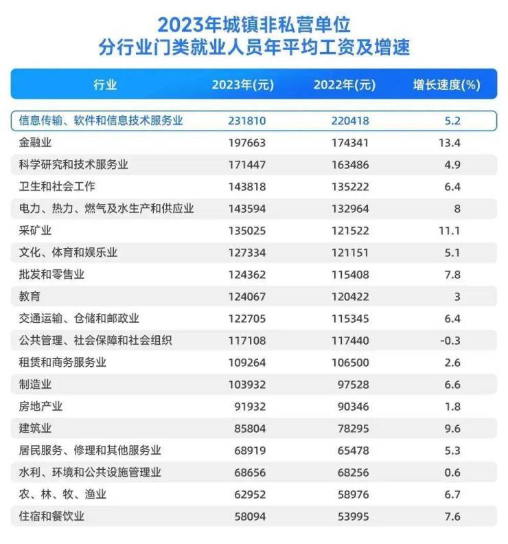 根据国家统计局发布的社会平均工资数据,去年平均工资最高的三大行业分别是互联网和软件信息产业,科研和技术服务业、金融业,而最低的则是农业、环保行业、住宿餐饮业。