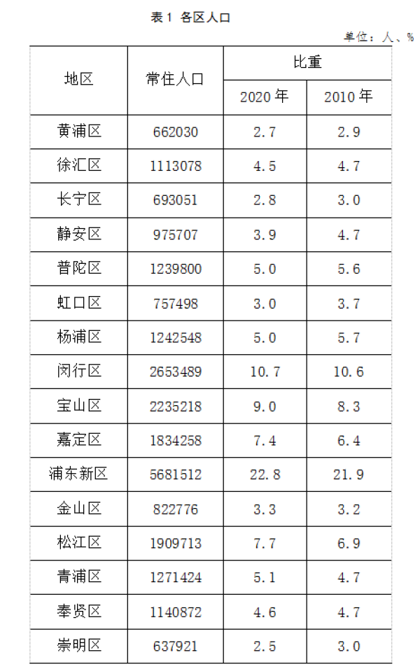 与六普(2010年)相比,上海中心城区(黄浦、徐汇、长宁、静安、普陀、虹口、杨浦)人口减少了30.25万人,占全市比重减少3.4个百分点。郊区人口(闵行、宝山、嘉定、金山、松江、青浦、奉贤、崇明)比重增加2.5个百分点。浦东新区提升0.9个百分点。